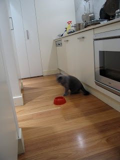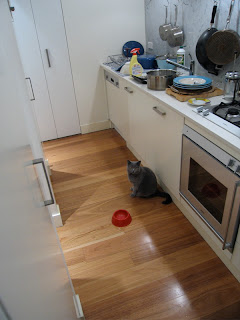 right in front of the cupboard we keep her tinned fish in. I wonder